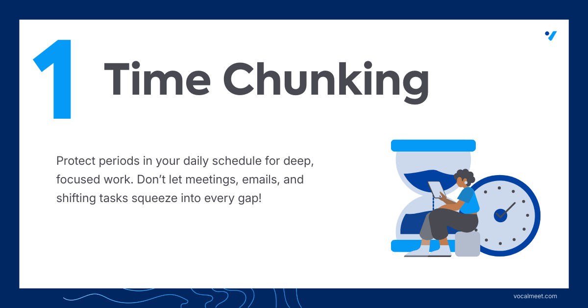 Time chunking (also called time blocking) is a time-management technique in which you divide your day into blocks of time, each reserved for a specific task or activity. It helps you manage your day more intentionally by deciding what you’ll focus on each hour.